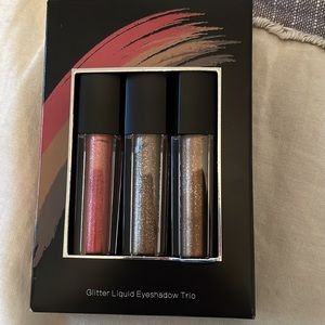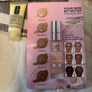 All new items. Travel size Clinique dramatically different moisturizer. Sample size IT Cosmetics foundation. 3 pack glitter eyeshadows from SHEGlam. Full size eyeshadow palette from Beauty Bakerie. Full size highlight palette from HipDot.