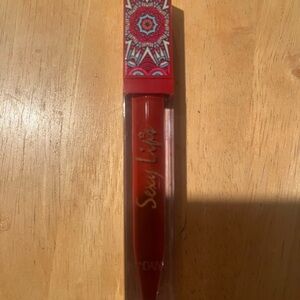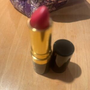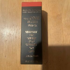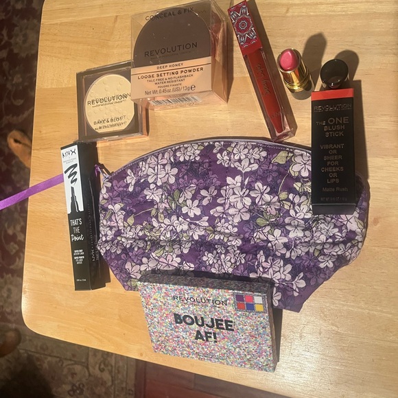 Comes with cosmetic bag, Revolution Boujee AF eyeshadow palette, Revolution Deep Honey Loose Setting Powder, red Lippie, Revlon Lipstick, Revolution Bake & Blot, NYX eyeliner