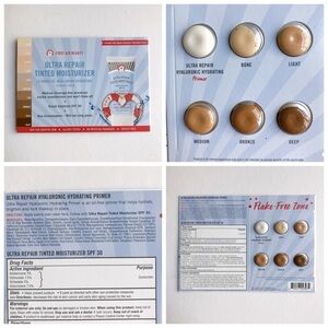 All brand new and unused makeup including full size The Balm eyeshadow palette (retail $28), full size Phase Zero lipstick, full size Noyah lip balm, 2 Moda Pro eyeshadow brushes and samples of First Aid Beauty foundation. Includes makeup bag.