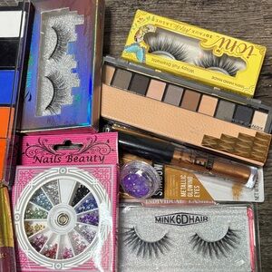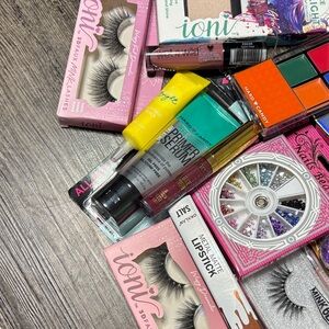Makeup Bundle includes: Liquid lipstick, primer , lashes, highlight, glitter, rhinestones, eyeshadow palette, & halloween makeup palette
