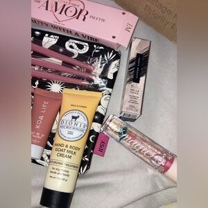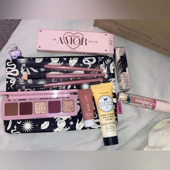 3 new makeup brushes Hand and body cream Eye treatment Lip gloss Mascara Eye palette Does not come with makeup bag