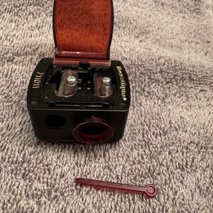 Double pencil sharpener with covers to catch the shavings & a pick to clean the sharpener- sharpens both the typical eye pencil sized pencils, and fatter ‘lip’ or ‘shadow”pencils.