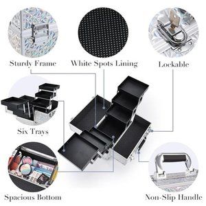 🧿Makeup Case with 6 Trays: This size makeup case is 11.8 x 7.1 x 8.8 inches. The extendable cantilever 6-tiers tray structure along with the spacious bottom ensures roomy space. The unique white spots lining design is a perfect gift for women and girls. Storage is flexible to fit in various sizes of cosmetic products such as your toiletries, nail polish, essential oils, jewelry, paint brush, and crafting tools. There is large bottom space for palettes and even travel-size bottles.