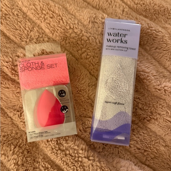 Includes a pink makeup sponge and makeup removing towel, and a lavender makeup removing towel. Reusable towels so they eliminate the need for makeup wipes!