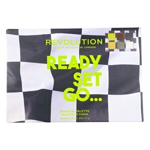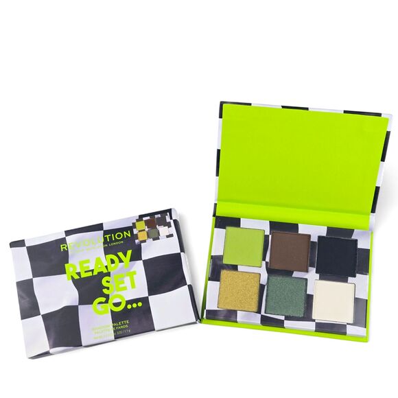 Makeup Revolution Power Shadow Palette in the shade "Ready Set Go." A six-pan eyeshadow palette featuring a mix of neutral, green, and gold tones.