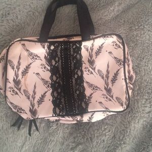 Pink with black birds flying makeup bag . It does have a stain on it FYI