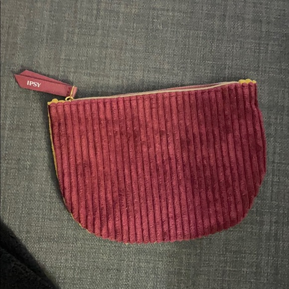 Soft fabric makeup bag, maroon and yellow, maroon interior, 4x6 inches