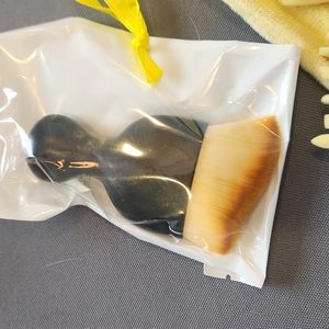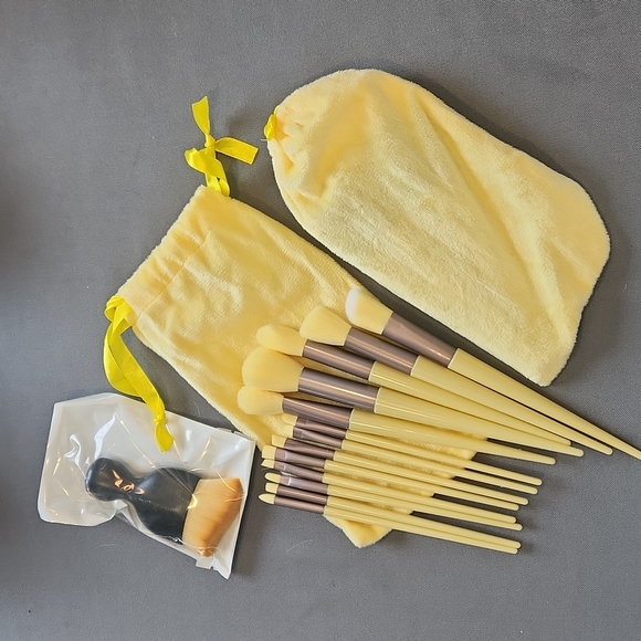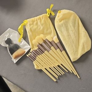 Lot of 2 pks. of beautiful yellow makeup brushes. Brand new and in yellow velvet bag. Also included is a small, fat brush perfect for foundation!