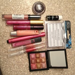Ardell individual lash in medium. Ardell lash tite adhesive in black (permanent). Stila lipgloss in Merry Merry. Stila lipgloss in blush C2. Liplicious in Strawberry Meringue (bath&bodyworks). Revlon ColorStay Ultimate in 002 Buffest Beige. Loreal in Arresting. Lorac in Frosted Gumdrop. Very Sexy in Torrid. Very Sexy in Baby Doll. Beauty Rush shadow from VS in a dark purple color (label fell). Mark touch & glow shimmer cream cubes.