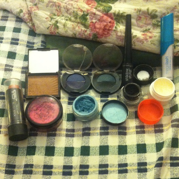 Twist up blush stick, bronzer, lash growing serum, black eyeshadow stick, blue sparkly eyeshadow, navy, blue, green & black eyeshadows, strawberry lip balm, all not used, pink face & body glitter, black liquid/cream eyeliner both lightly used.
