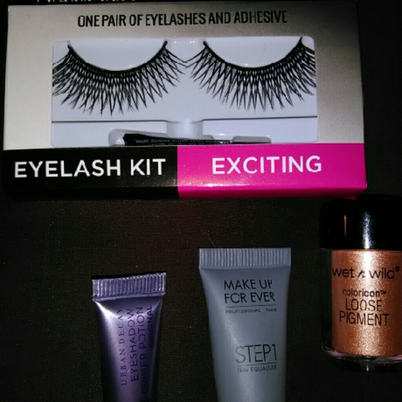 6 PC bundle with Beautiful luscious wispy lashes, deluxe size makeup forever primer, urban decay eyeshadow primer potion,wet n wild loose pigment can also double as a highlighter,2 new butter London full size glosses (see photo) for shade reference
