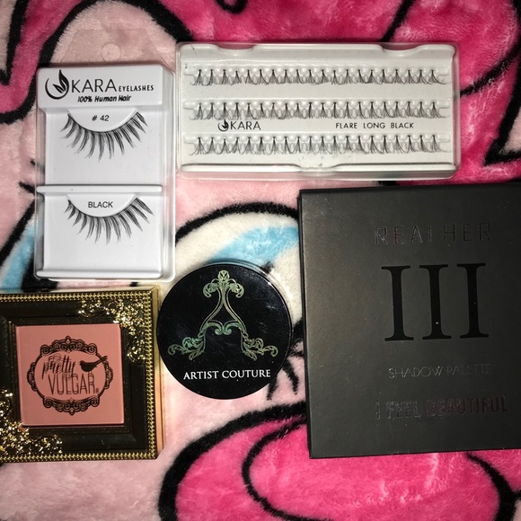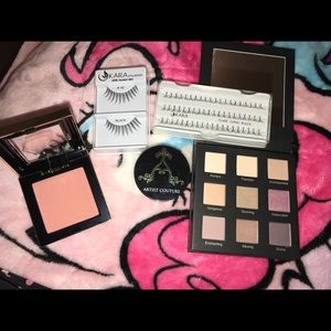 Real her 3 makeup palette, pretty vulgar blush, Kara lashes and individual lashes, and artis couture loose highlight. Never used the highlight just swatched it so doesn’t have seal on it anymore. Only swatched eyeshadow palette 2/3 colors. Feel free to make me an offer 😚