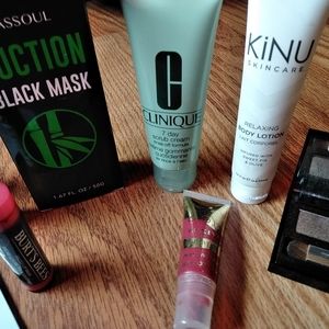 Two Retinol face masks, black suction mask bottle, Kinu body lotion, Estee Lauder lash primer plus, Clinique 7day stub cream, complexion enhancer, Merle Norman grenadine lip gloss, mannequin shimmer eye shadow, lip stick duo, light brown root cover up, and Burt's bees tinted rose lip balm.