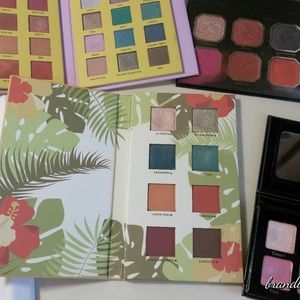 Selling name brand eyeshadow palettes such as spoiled lips cosmetics,Alamar,storybook cosmetics,Violet Voss,Dominique cosmetics and Sugar rush C.y.o brand lips sticks includimg velvet matte and cheek and lip stain and gloss.Lip liner and liquid eyeliner also a couple single eyeshadows. Anatasia Beverly hills brow pomade and Billion dollar brow brow butter. I will also include a free e.l.f daily hydration moisturizer free with purchase. Everything is in likenew condition.
