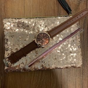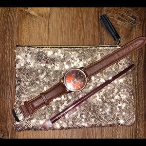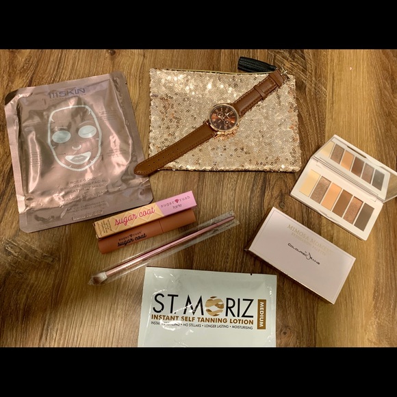 7 pieces all brand NEW! One facemask eyeshadow brush lipgloss eye shadow palette self-tanner makeup bag New brown leather watch!!