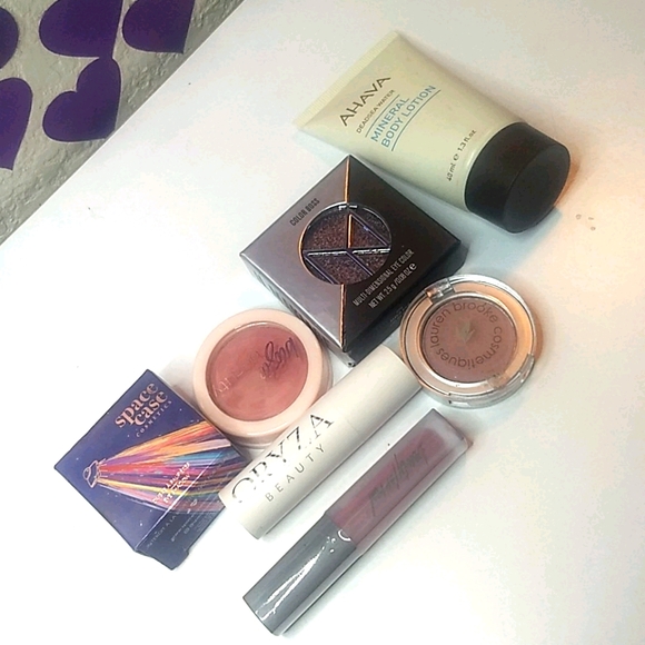 Space case "space food" eyeshadow(was lightly swatched) Lauren Brooks "sweetpea", Basic beauty "It's October 3rd" Jelly blush, IL Makiage Girl Boss "Alter Ego" color boss eyeshadow, mini beauty for real liquid lipstick lip cream "hotter than Miami", Oryza beauty lipstick in "Opus" and Ahava deadsea Mineral body lotion