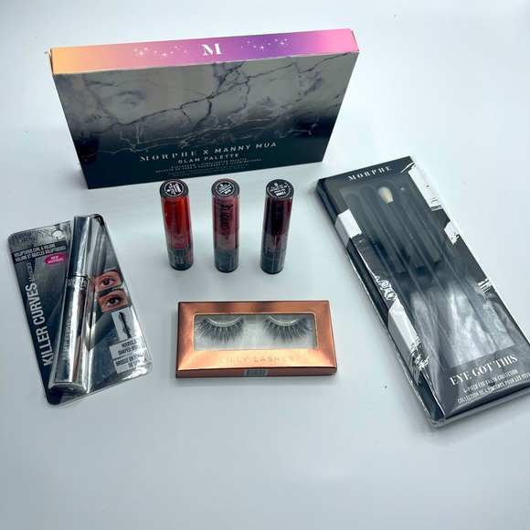 *brush collection. *lilly lashes. *mascara physicians fórmula. *eyeshadow + Highligther palette. *3 matte lipstick wet n wild.