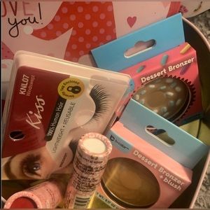 Makeup bundle includes one valentines heart tin filled with all the makeup listed in the pictures, two packs of eyelashes, one bronzer, one blush and two lip colors and one Kylie and Kendall small backpack.