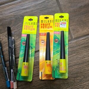 please see pictures various stuff...would be good for dress up or costume parties... there is 3 Milani fruit fetish eyeliners two green one yellow, 2 blk/opl amethyst lipstick, Revlon colorstay satin ink in up all night(purple), 2 eyeliner and 1 lip liner. all new never opened