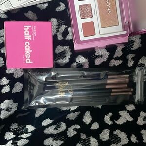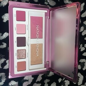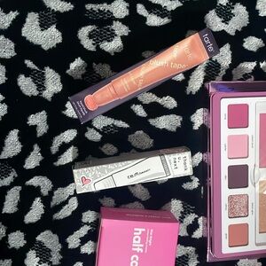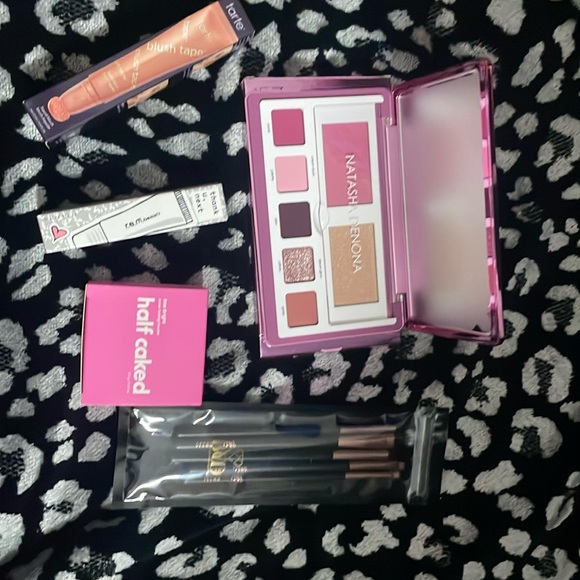 Makeup bundle Natasha denona love face palette, tarte blush tape in peach, rem beauty clear lipgloss, half caked pink powder, eyeshadow brush set