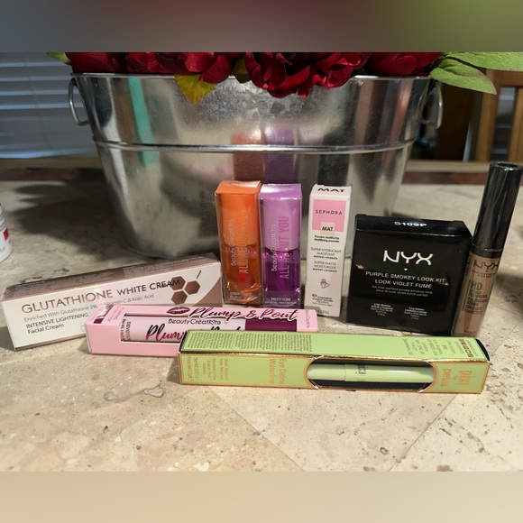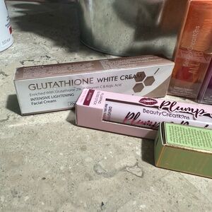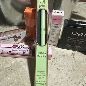 Lip oils, eyeshadow, eyeliner, face cream, dark concealer.