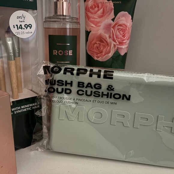 Morphe set featuring a mint brush bag and cloud cushion. Ideal for makeup lovers.