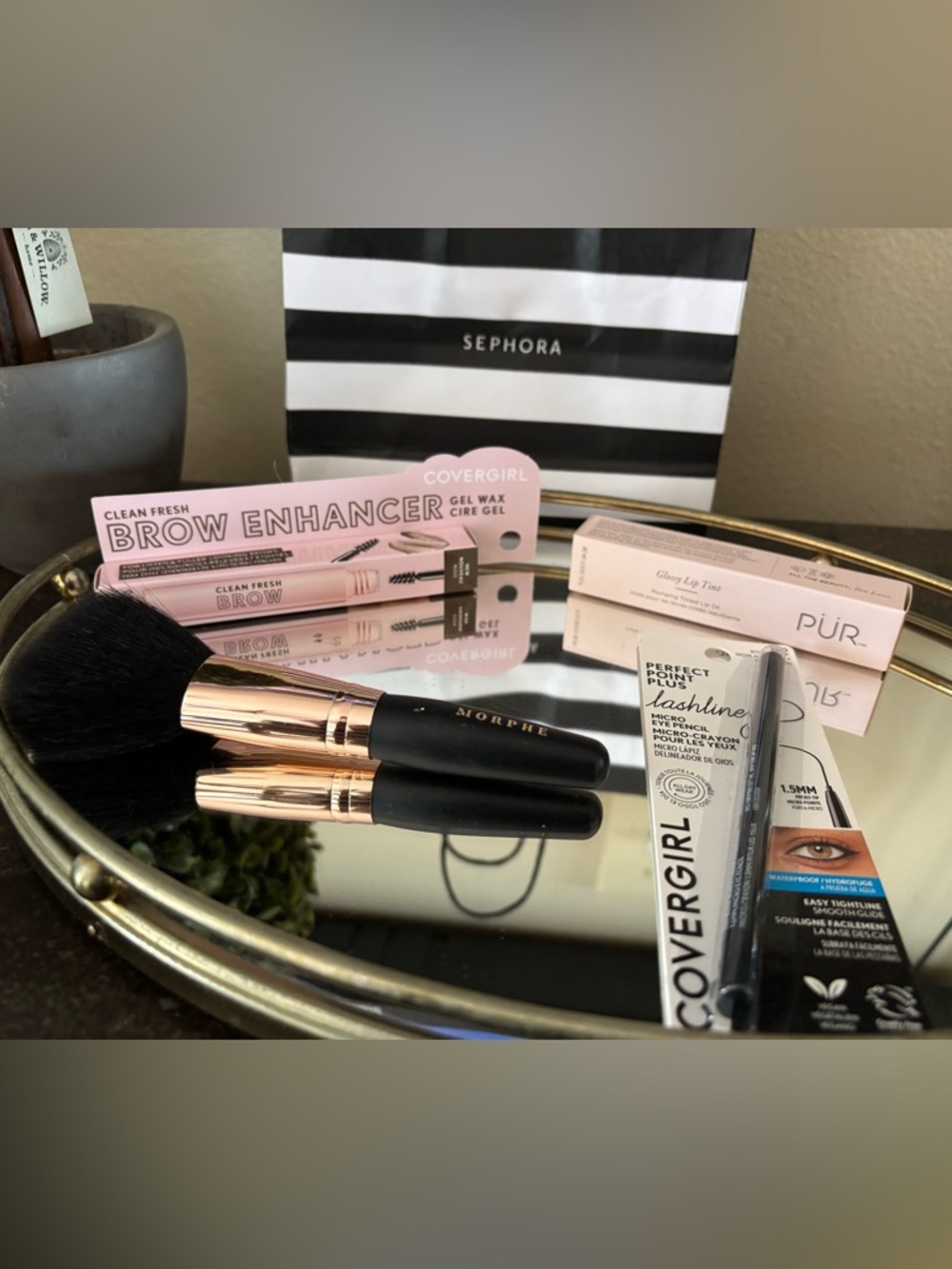 Makeup bundle including brushes and beauty products.