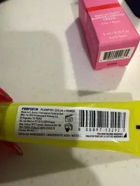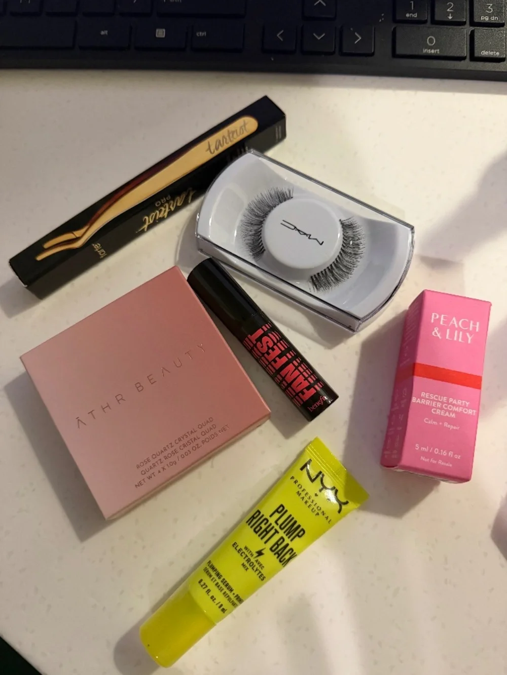 Eye shadow palette. Primer. Mac lashes with Tarte tool for application. Sample size mascara and sample peach and lily product.