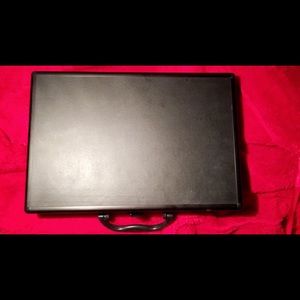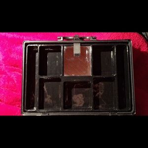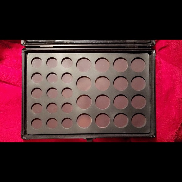 Professional make up case, 16 large circles for blush, bronzer, powder, etc, 15 small circles for eyeshadows on one side. The other side has a small mirror, 2 long places for lip pencils, eyeliner, mascara, etc. 5 squares for makeup or hair Products.