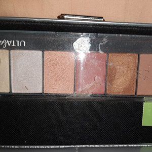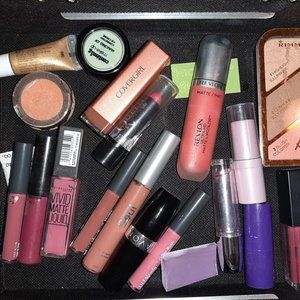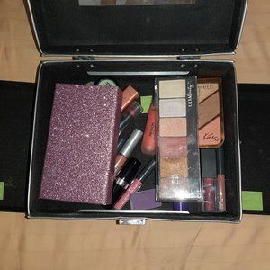 makeup case with some palettes, gloss and lipsticks. Many used items, others almost new. Contains a Victoria's secret eyeshadow palette. Mirror lid and two side drawers, great for storing your makeup