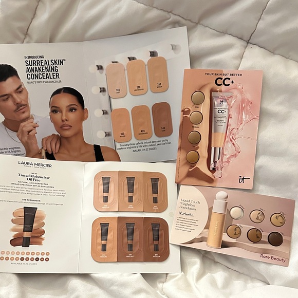 Makeup samples Laura mercier tinted moisturizer Makeup by Mario concealer CC+ tinted sunscreen Rare beauty weightless foundation