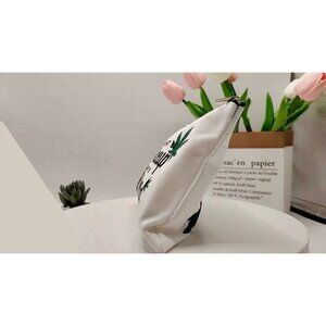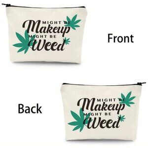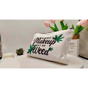 This little bag is light-colored canvas, and it's got a funny saying on it – "Might Be Makeup, Might Be Weed." It's got green leaf designs too, which add to the vibe. It's got a zipper, so you can keep your stuff inside, and it's small enough to throw in your purse or bag. It's just a simple pouch with a bit of a playful and edgy look.