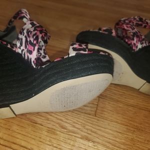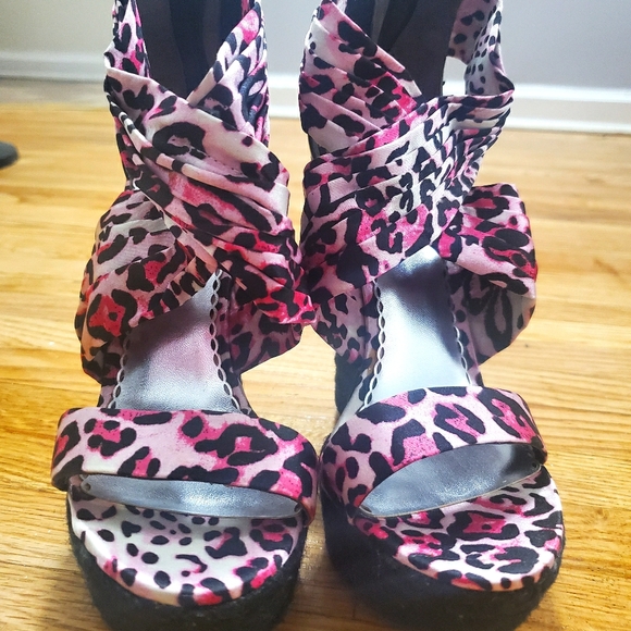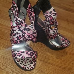 Gorgeous and comfortable Bebe wedge pink leopard print sandals...true size 5...only one use for couple hours.