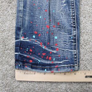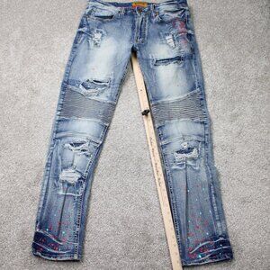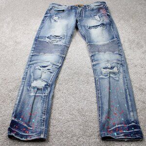 Makobi Cape Biker Jeans Mens 34x32 Blue w/ Paint Splash Distressed Moto Denim