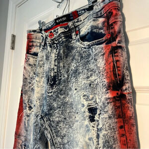 Makobi Jeans Mens 40 X 32 Paint Stroke Shredded Distressed Biker Slim Fit