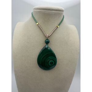 Malachite Teardop Pendant Necklace On Green and Beige Adjustable Rope