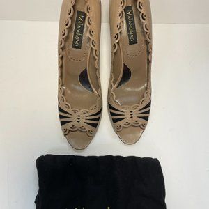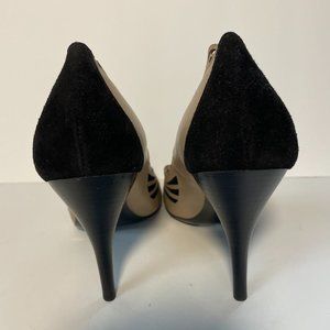NWT: These beautifully designed peep-toe heel with cut-out scalloped edge accents in leather predate those that flooded the expanded market of Malandrino shoes eventually sold in big-box stores. The true color of the shoe is more of a latte tone leather, with black suede on back side and black suede inserts over the instep. Size 40 with a 4" heel. Dust bag included.