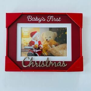 This is a red photo frame with white mat and silver lettering that says "Baby's First Christmas". This frame can hold a 4x6 frame with the mat or 5x7 without the mat.