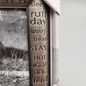 Dog themed photo holder/picture frame. Nice quality, heavy pewter frame with glass insert. Holds a 4" x 6" photo.