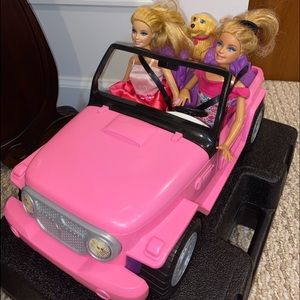Barbie uses her Jeep to cruise along the shores of Malibu with her friends and her pup Taffy. This is a pink and purple Barbie Jeep with seat belts, moving wheels and a place in the back for Taffy to sit.