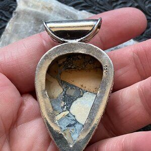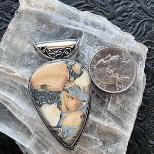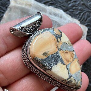 Pendant of a Maligano jasper crystal stone in a vintage styled 925 silver plated frame and bail.