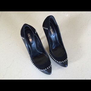 These Malin pumps offer the perfect mix of sex appeal and style. The incredibly edgy design is composed of black suede and smoothesther with a pointed toe and silver stud details. It has a 4 3/4" heel and 1" hidden platform, they were only used once and are in great condition. Size 5.5