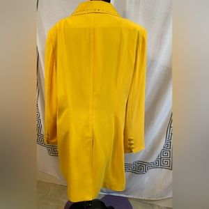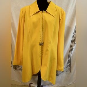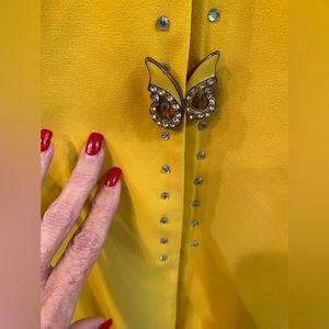 Malina’s Bright Yellow Jacket. This is really bright and a pretty yellow. Snaps up the front with covered buttons butterfly on it. The rhinestones line the color as well. Bottom of sleeves have 3 buttons with more bling. Bottom Slit. No pockets. Size 22