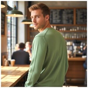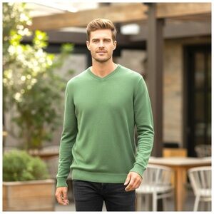 Stylish green V-neck cashmere sweater. Perfect for casual wear or dressing up an outfit with jeans.