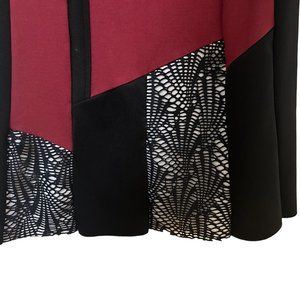 A formal A-line skirt, featuring contrasting fabric panels, lace and red panel in front. Black on back, stretchy wrinkle-free material and slim straight cut.