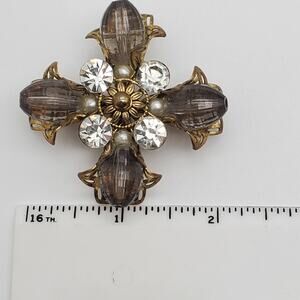 Maltese Cross Brooch Smoke Acrylic Gothic Revival Pin Gold Tone Rhinestones Vtg