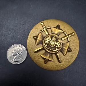 This vintage brooch features a 2.5" D gold tone circle with a Maltese cross or Coat of Arms