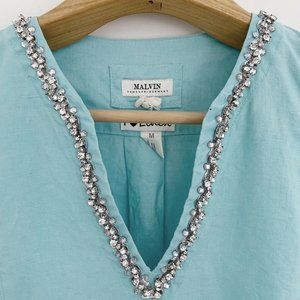 Sky blue Malvin Linen Raw Clothing Tunic embellished with stones and crystals on the neckline. Slight side slits on both sides. Beautifully tailored. 100% Linen. Size 12 . Measurements : sleeve 17 in., shoulders 16 in., bust 40 in., hips 40 in., length tunic 30 in.. Brand new with tags .