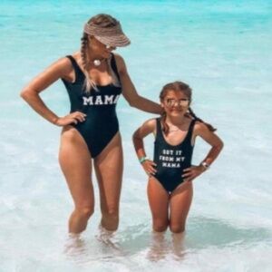 White block lettering spelling out “Mama” across the front of the suit. High waisted, supportive padded (removable) interior with open-back design. Wireless.