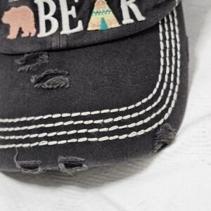 The cap boasts a distinctive bear and logo theme, with embroidered accents that add a touch of personality to your outdoor adventures or casual outings. The distressed details give the cap a trendy, lived-in look that's perfect for those who appreciate a piece with a bit of character. Whether you're out for a hike or running errands, this baseball cap is a functional and fashionable accessory to complement your style.